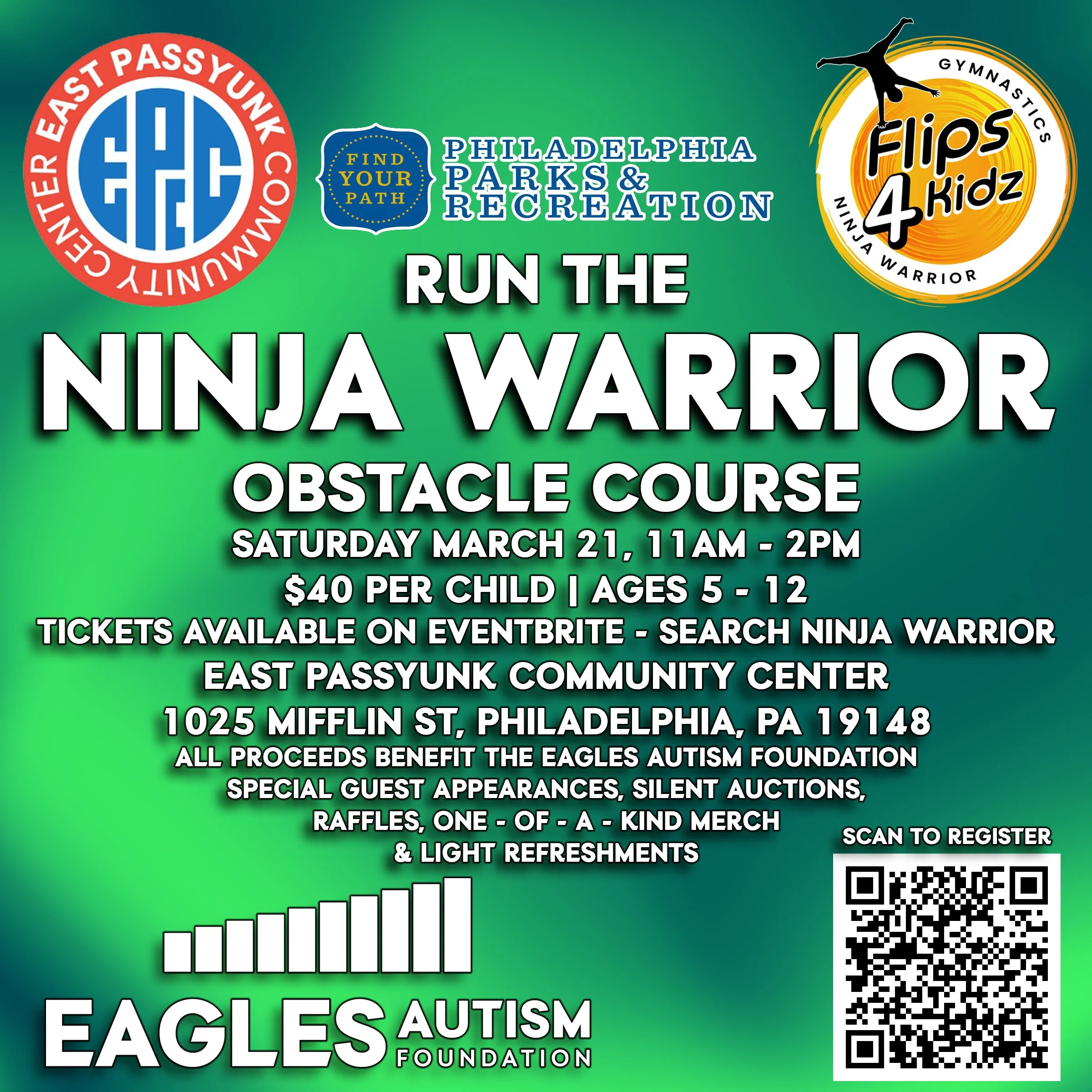 Saturday March 21, 11AM - 2PM $40 Per Child | Ages 5 - 12 | All children participating must register Ninja Warrior activities will occur at 2 times during the event. Once at 11:30 & again at 12:30. Children may participate in both sessions! Quiet & sensory room will be available for all to use. yunk Community Center -1025 Mifflin St, Philadelphia, PA 19148 Special Guest Appearances, Silent Auctions, Raffles, One - Of - A - Kind Merch & Light Refreshments!